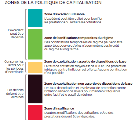 Plus précisément, la politique de capitalisation sert à déterminer s’il est possible ou nécessaire d’augmenter ou de réduire les prestations, de baisser ou de hausser les cotisations, ou de simplement conserver les actifs pour les périodes d’incertitude. La politique de capitalisation décrit les mécanismes privilégiés associés à ses diverses zones de capitalisation et, au bout du compte, il appartient aux répondants de décider des mesures à prendre.